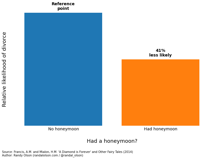 This graph shows that couples who had honeymoons after the wedding are 41% less likely to get divorced.