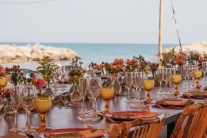 Guests enjoying local Mediterranean cuisine and signature rice dishes during a Calafat wedding.